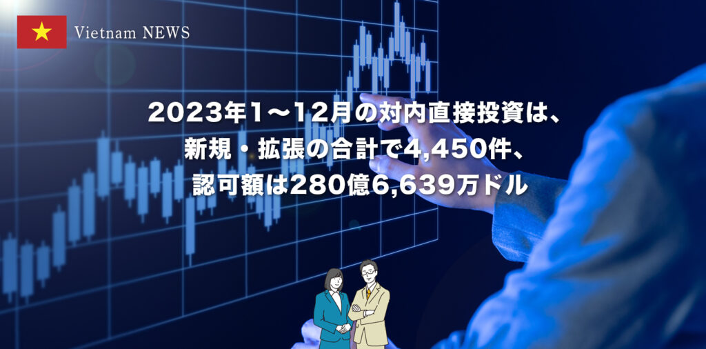 ジェトロビジネス短信記事によると、ベトナム外国投資庁によれば、2023年1~12月の対内直接投資(認可ベース、12月20日時点の速報値、出資・株式取得を除く)は、新規・拡張の合計で4,450件(前年比41.6%増)、認可額は280億6,639万ドル(24.4%増)だったとのことです。