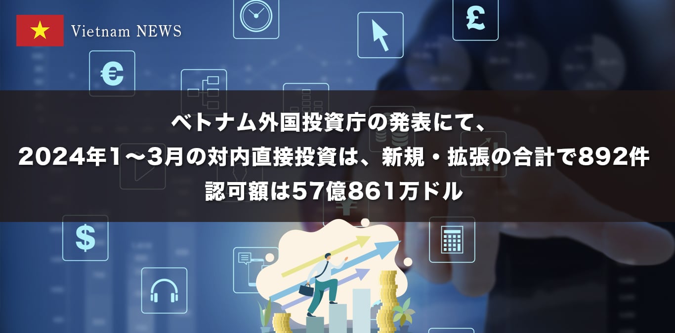 ベトナム、2024年1~3月の対内直接投資892件、中国、香港からの投資が活発
